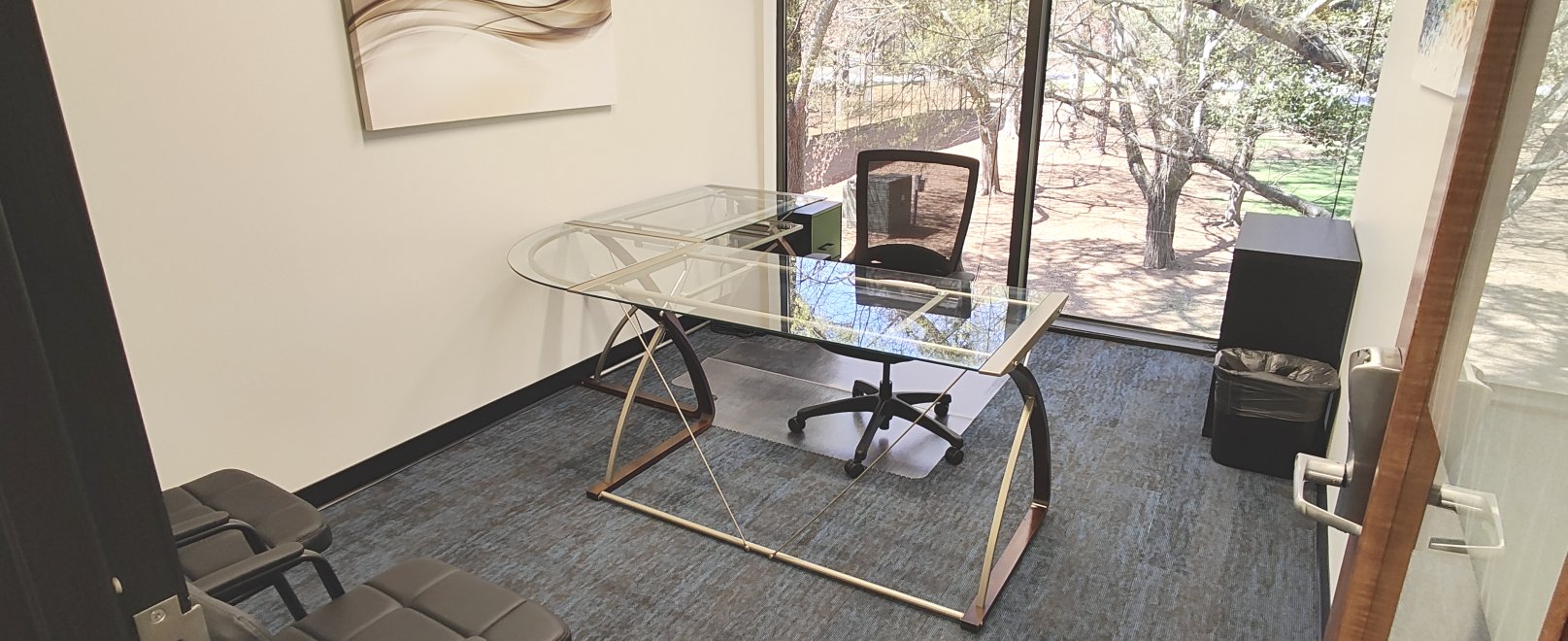 Offices for Rent: This beautiful TRUE Space business center features several large rentable window offices. Some offices contain large "L" shapeed glass desks that makes it easy to spread out and work, while others offer two large glass desks for multiple workers. Furnishings also include a lockable file cabinet, bookcase, chair and chair mat, and two guest chairs in each office. Each rentable office can accommodate up to 2 people.